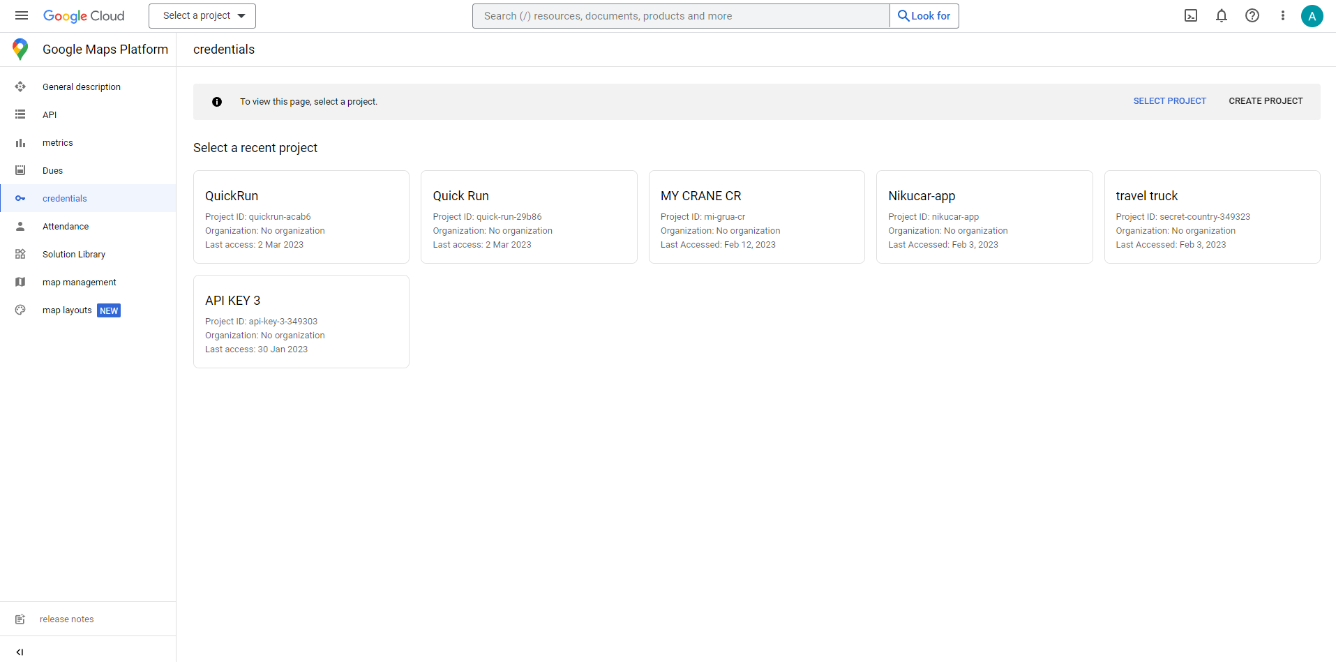 Step 5: This will take you to your dashboard in the APIs section. If it's your first time accessing it, you'll be asked to select a project. If you already have projects created in Firebase, you'll be prompted to choose one. Otherwise, you'll be asked to create a new one.