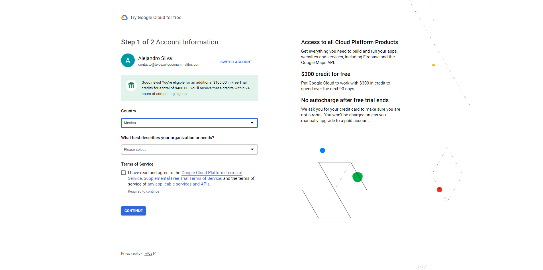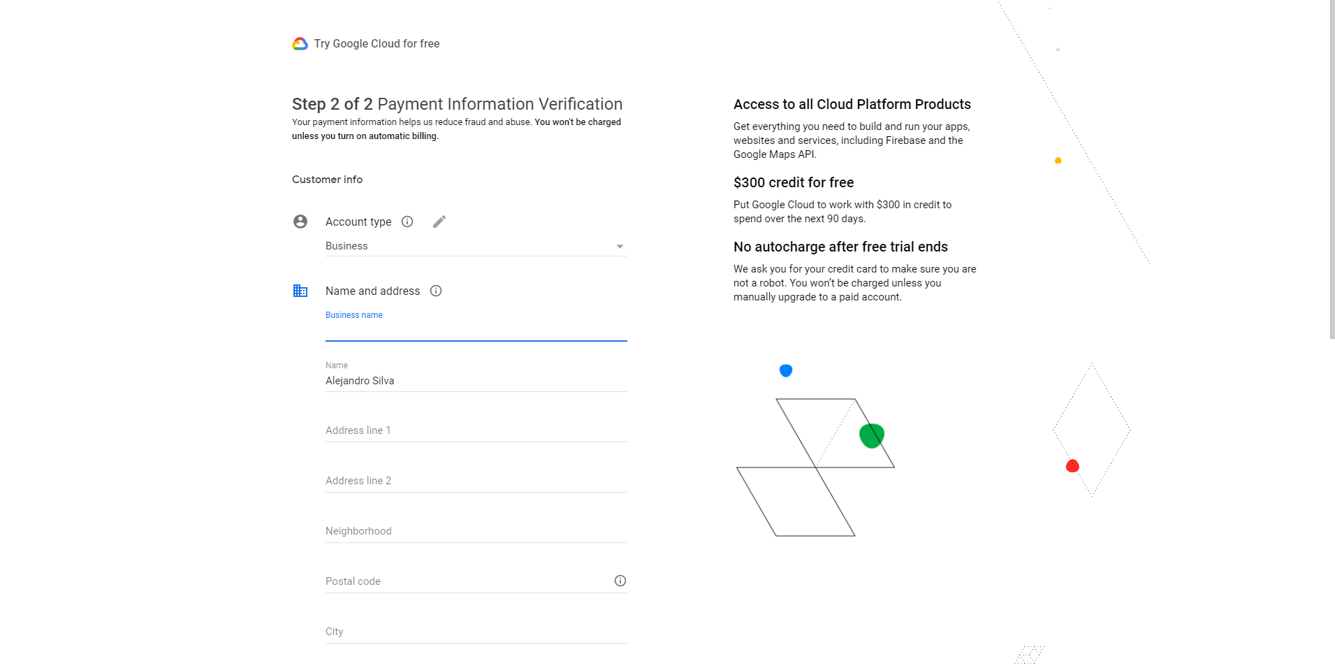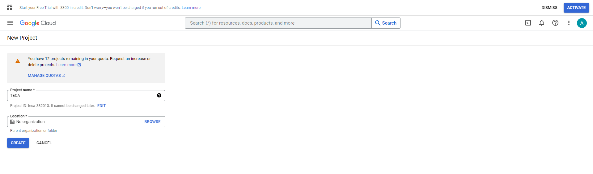 Step 8 :  To create a new project, you will be asked to provide the following information: If you already have projects created previously, you will be asked to assign a billing account to it, as shown in image (A). If you don't have any previous projects, it will only ask you for the information shown in image (B). Here's what to enter in each option: