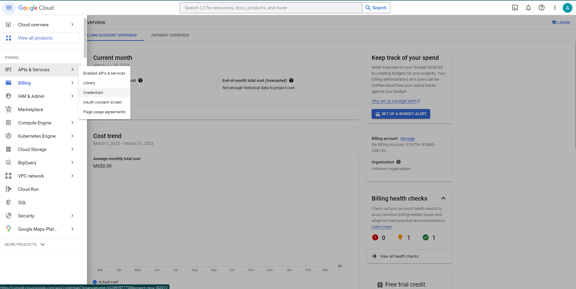Step 9: If we don't have billing associated with our project, it is mandatory to have a payment method assigned, as Google provides a free tier of $200 per month, which is sufficient for your development environment and for the launch once in production. However, when exceeding this free tier, charges will be incurred. Therefore, we will navigate to the top-left menu icon and select the billing option.