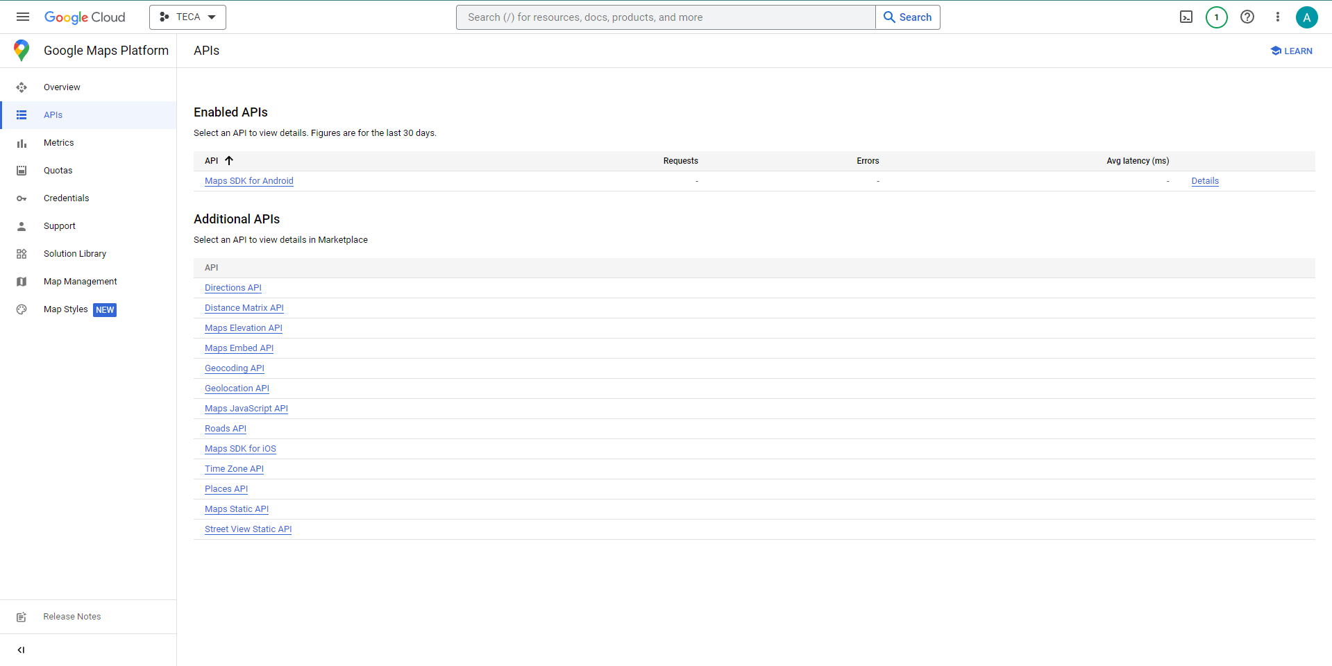 Step 23: On the screen, you will see two sections: "Enabled APIs" (your active services) and "Additional APIs" (other services you can activate). In the first section, you can see your active services, such as the Maps SDK for Android that we activated in the previous step. Now, you must select each of the additional services and activate them by clicking on each one of them, repeating step 22, to have all the functionalities active.
